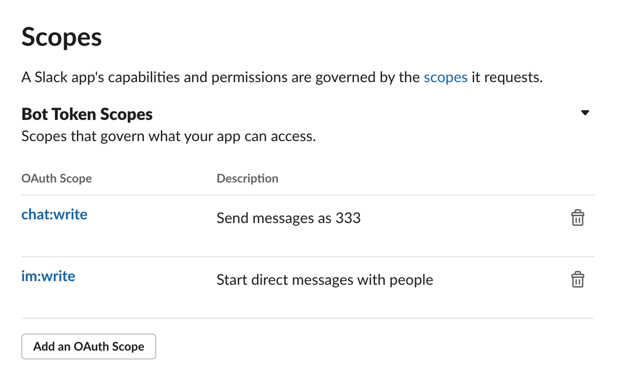 Scopes에서 Add an OAuth Scope를 통해 필요한 권한을 줍니다.